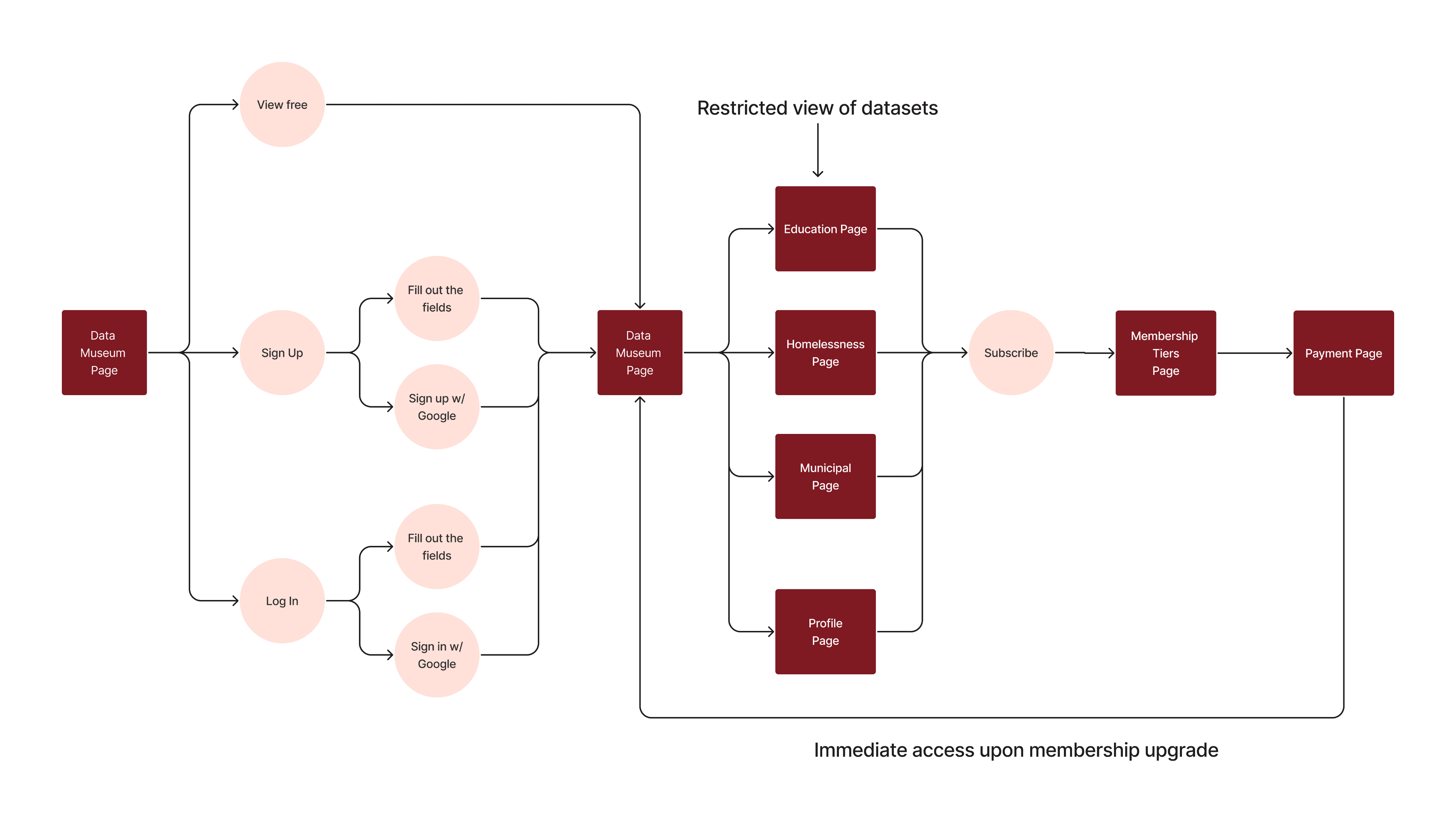 It highlights the varied access levels to the data visualizations for different membership statuses, addressing our client's concern regarding low subscriber numbers. Users who browse the website without signing up can only access limited datasets, whereas those who sign up, either for free or a membership, gain access to more datasets based on their membership tier.