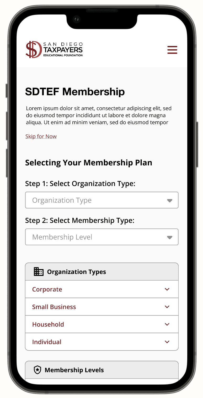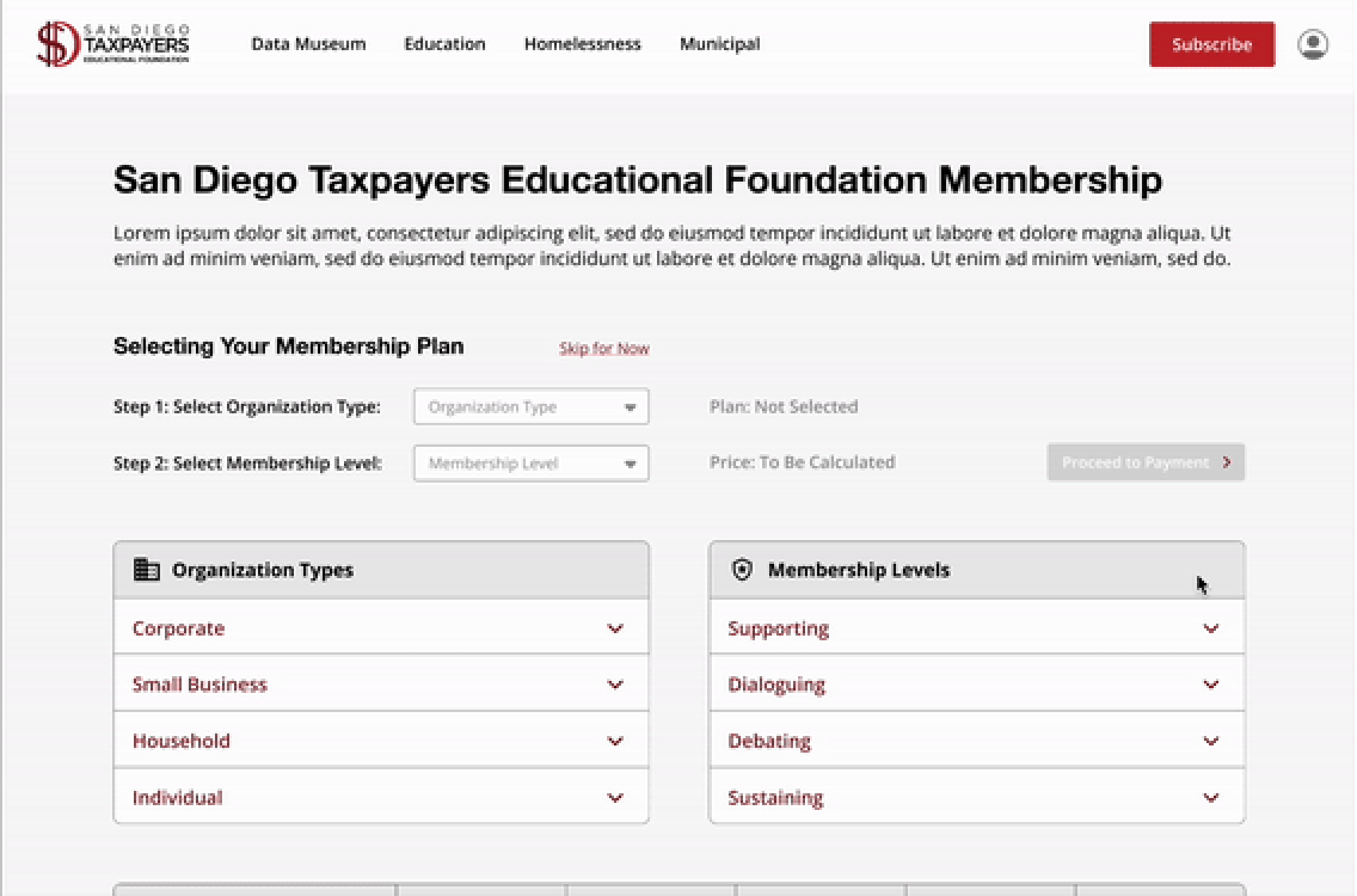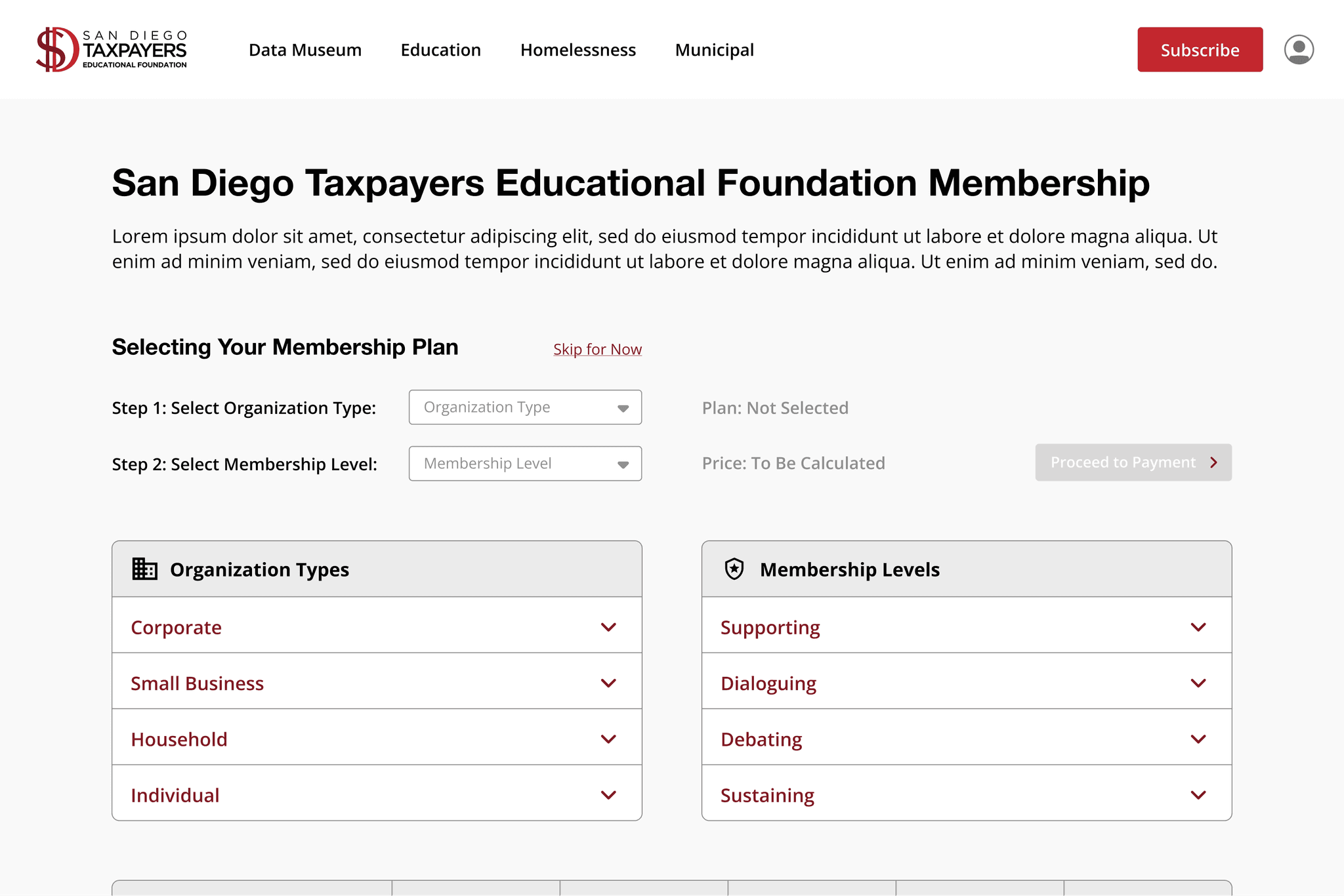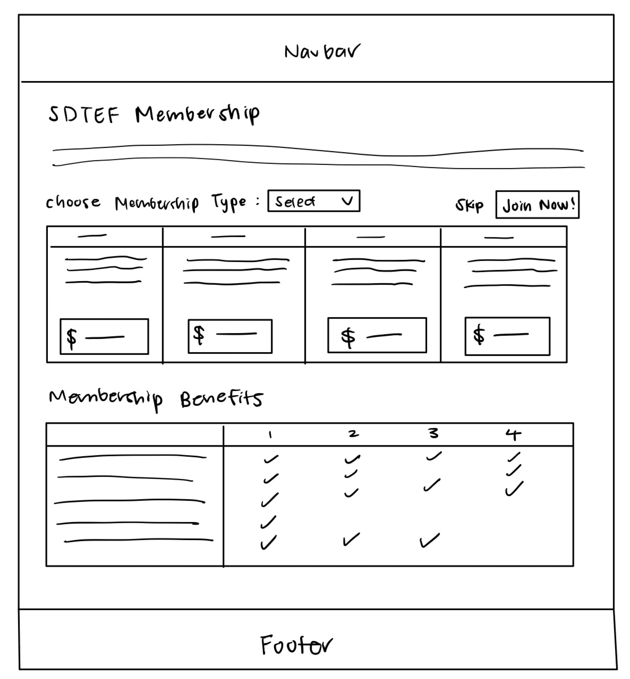 In order to craft a user-friendly website and streamline the membership tiers page, my initial approach involved developing low-fidelity wireframes. These wireframes served as foundational sketches, allowing us to explore various layouts for presenting information. Among the options considered were incorporating a drop-down menu and opting for a straightforward display format.